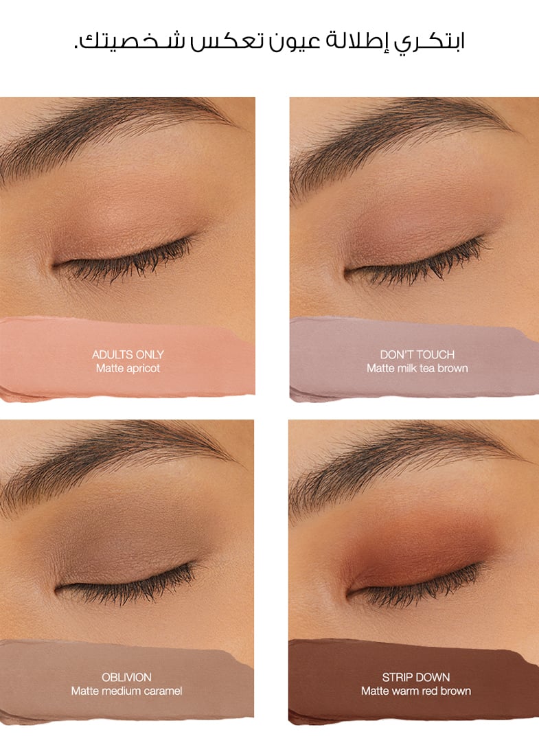 إذا كان لون البشرة فاتحاً إلى متوسّط، يُطبّق لون ADULTS ONLY أو DON’T TOUCH على كلّ الجفن. يُدمج الطرف نحو أعلى ثنية الجفن بواسطة أطراف الأصابع للتأكد من تدرّج الألوان معاً.